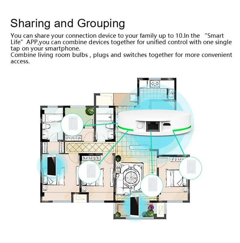 - Sharing and Grouping: You can share your connection device to your family up to 10.In the Tuya/Smart life APP , you can combine devices together for unified control with one single tap on your smartphone. you can easily combine living room bulbs , plugs and switches together for more convenient access.