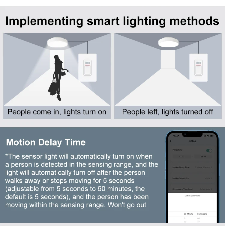 Home Motion Sensor Light Indoor|Lutron Switch Motion Sensor|Smart PIR Motion Sensor:Automatically turns lights on/off based on room occupancy, with adjustable time delay for energy-efficient home automation.